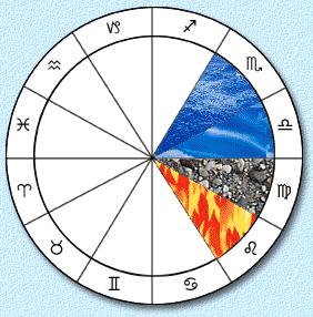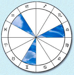 resistant to ideas or interactions in general. Air: Air opens up space for freedom and movement. Air is present when we are thinking or communicating in systems or languages, abstracting or comparing, connecting ideas or people. Air 'widens our horizons' or 'blows us away' with understanding and insight. When frustrated, air avoids dealing with reality by flying off into worlds of nonsense or fantasy. In its physical form, air is found in wind and sky (and birds, which can navigate these) and breath. A person with a predominance of Astrological air (Sun, Moon, Ascendant or other