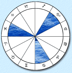 will tend to be argumentative or distracted. Water: Water is the element that nurtures all of life. Our bodies are 50-70% water. The health of our elemental water effects our emotions and our overall sense of well being. Water can bring tears of joy or sadness, nourishment or poison. When frustrated, water will create emotional and physical pressure until it is released, if not voluntarily through disease or emotional outbursts. In its physical form, water is found in streams, lakes and oceans, in food and drinks and in chemicals that act as containers for various forces. A person with a predominance of Astrological water (Sun, Moon, Ascendant or other planets in Cancer, Scorpio, or Pisces) responds to sensitivity, sharing, compassion, nurturing, feeling, intensity. If their water element is healthy and well balanced, this individual would also be receptive to incorporating the other elements: inspiration and creativity (fire), practical issues (earth), and a wider perspective (air). If their water qualities are blocked or frustrated, they will tend to be moody, withdrawn or 'stewing' in their emotions.